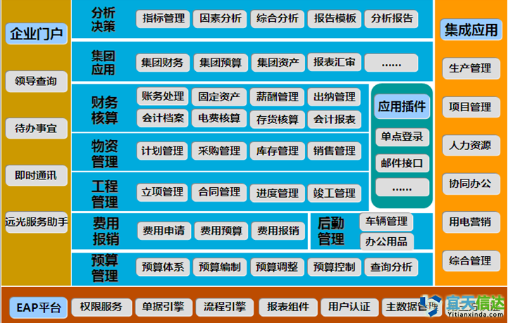 Ø 利用EAP平臺門戶完成同平臺的客制化開發,快速響應個性化需求。實現單體企業內業務信息的橫向集成,縱向貫通。