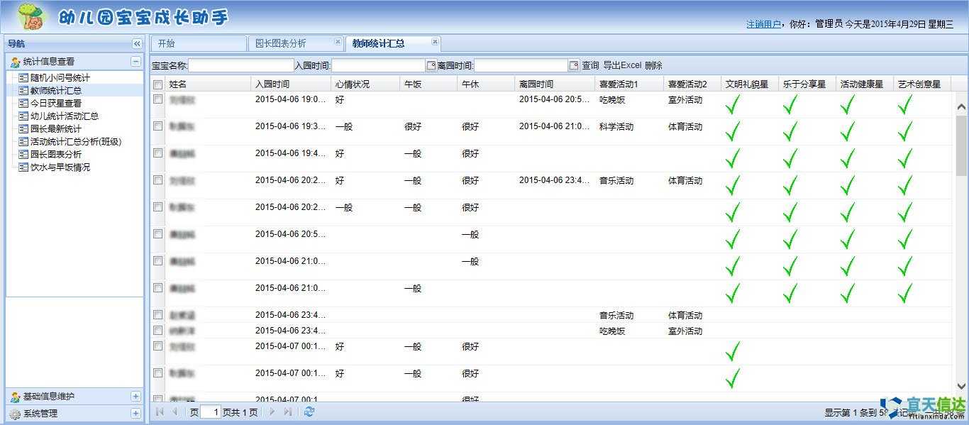 我們以為給了孩子生命,給了孩子更好的物質享受,我們就是很稱職的爸爸媽媽,我們以為把孩子送到幼兒園,孩子就會自己長大……一個孩子只有一次童年,不會再給你第二次哺育的機會;缺失了對孩子的陪伴和專業的孩子成長記錄、分析,無法給予適合孩子成長發展的專業指導,內心的失落和愧疚無法彌補……幼兒園寶寶成長專家系統,從孩子上幼兒園的第一天起,每一天每個孩子都將擁有一份專屬于自己的成長記錄,每一個孩子都將得到尊重和同等的關注,客觀公正的記錄 。
